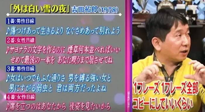 そして、歌詞の1番が“振る”男性目線、2番が“振られる”女性目線、3番が男性、4番が女性と交互に視点が変わり、まるで1本の映画のストーリーのようになっていて「1フレーズ1フレーズコピーにしていいくらい、ものすごい綺麗な詞が続く」と熱弁。石橋も「ゆっくり聞いてみよう」とうなった。