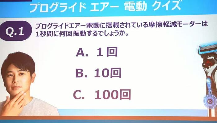 1問目の「新製品に搭載されている摩擦軽減モーターは、1秒間に何回振動するでしょう?」というクイズには、2人揃って、「B.10回」と回答。
