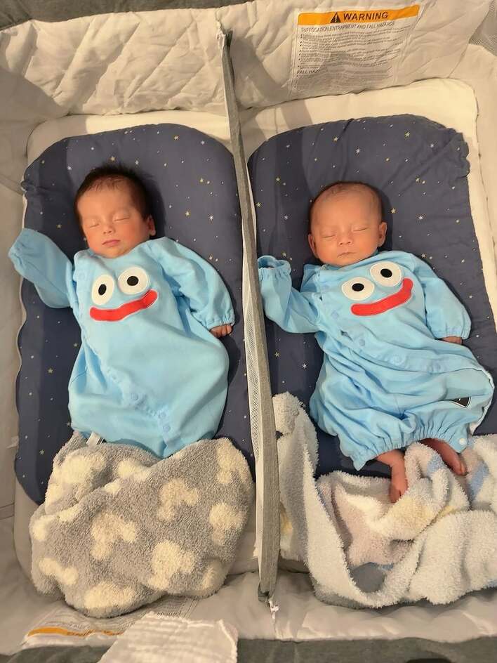そんな中川さんは「新生児期もうすぐ終わってしまう!シンクロスライムかわいかったです」とつづり、双子が人気ゲーム『ドラゴンクエスト』に登場するキャラクター・スライムがモチーフとなった服をおそろいで着たショットを公開。