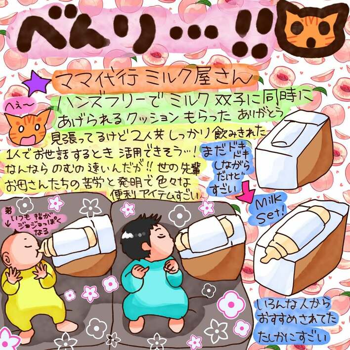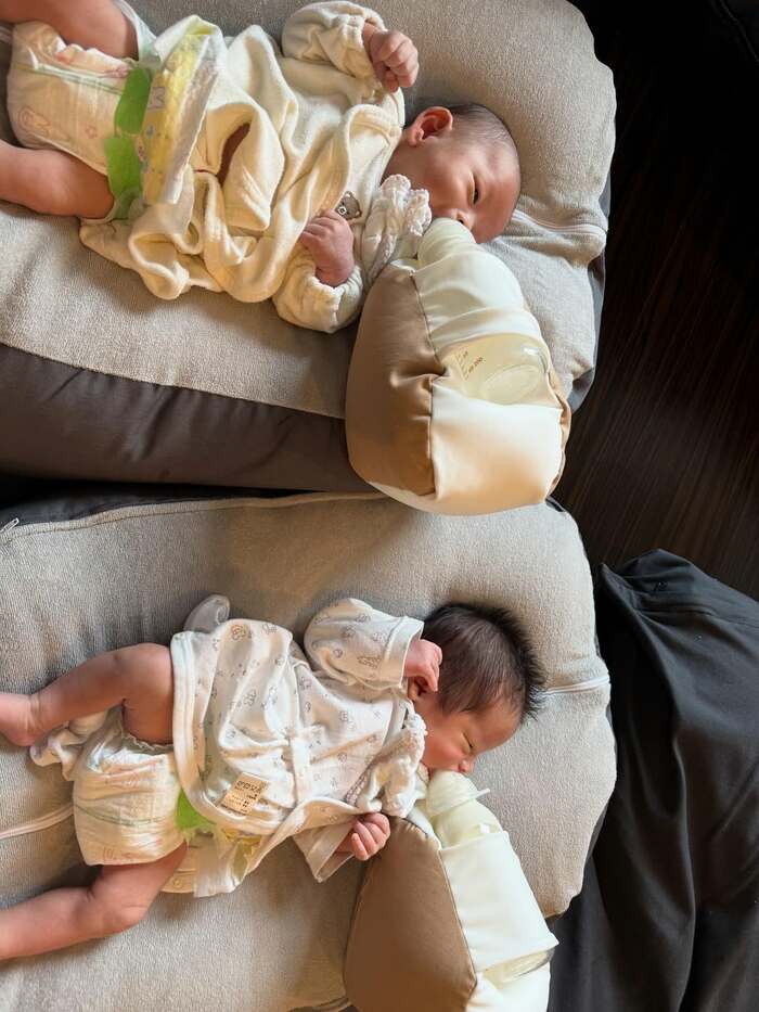 このクッションはいろんな人からおすすめされていたようで、実際に寝かせた双子の顔の横に、哺乳瓶をセットしたクッションをそっと置くと、2人とも1人でミルクを飲みきることができたと明かし、「1人でお世話するとき活用できそう」「便利アイテムすごい」などと、感激している様子を見せています。