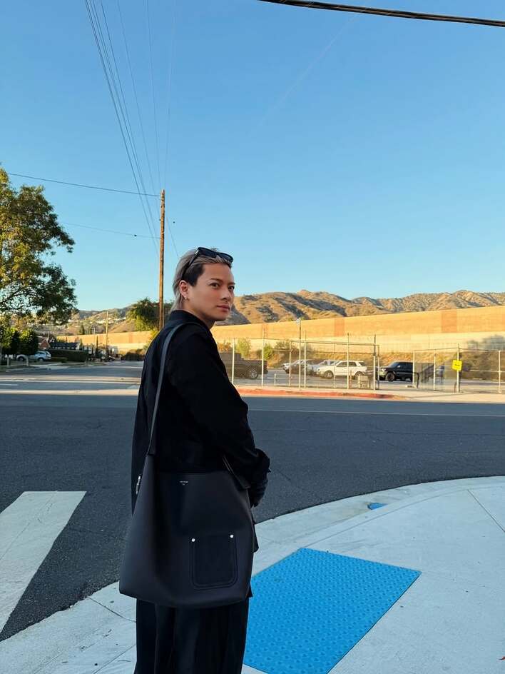 雲一つ無い青空の下で、スタイリッシュなオールブラックコーデを披露した平野さん。
