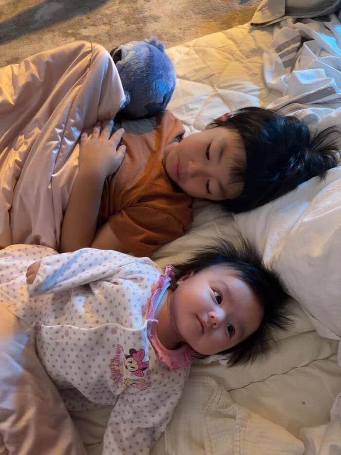 公開された写真を見てみると、映画を見ているときに撮影したのか、もうすぐ生後4カ月を迎える次女“ググガガちゃん”がつぶらな瞳でごろんと布団の上に寝転ぶ隣で、一緒に寄り添うように横になっている長男“カゲトラくん”の姿が!