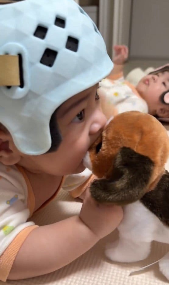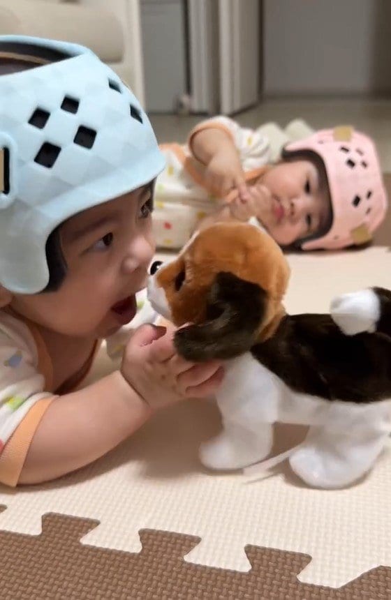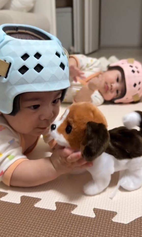 長男・“ぴーくん”は、ジョイントマットの上に腹ばいになって寝そべり、目の前にある鳴き声をだしながら歩く犬のぬいぐるみをつかんでいて、一方、長女・“りーちゃん”はその隣でごろんと横になっています。