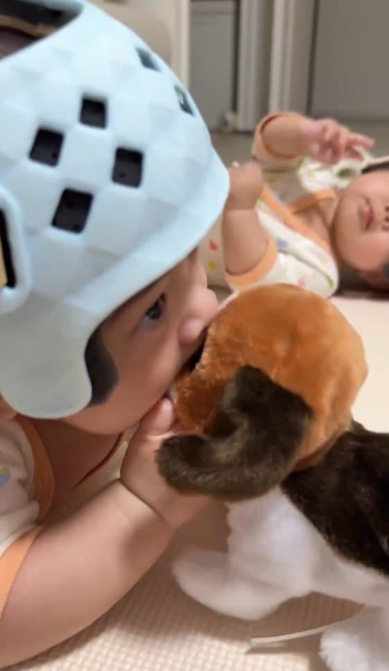 動くおもちゃに対しても動じることなく、あむあむと食らいつく活発なお兄ちゃんと、我関せずでマイペースな様子を見せる妹ちゃん、それぞれの個性が感じられてなんだかほっこりしますね。