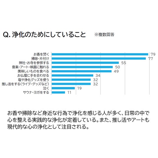 浄化行為は、宗教儀式から日常の心身ケアへと広がっており、コロナ禍以降「香りを焚く」「空間を整える」「心をリセットする」行為が、マインドフルネスやウェルビーイングの一環として再評価されています。“浄香”シリーズは、そうした時代の変化に応え、古来の「浄め」を現代のライフスタイルに再構築した香りブランドです。