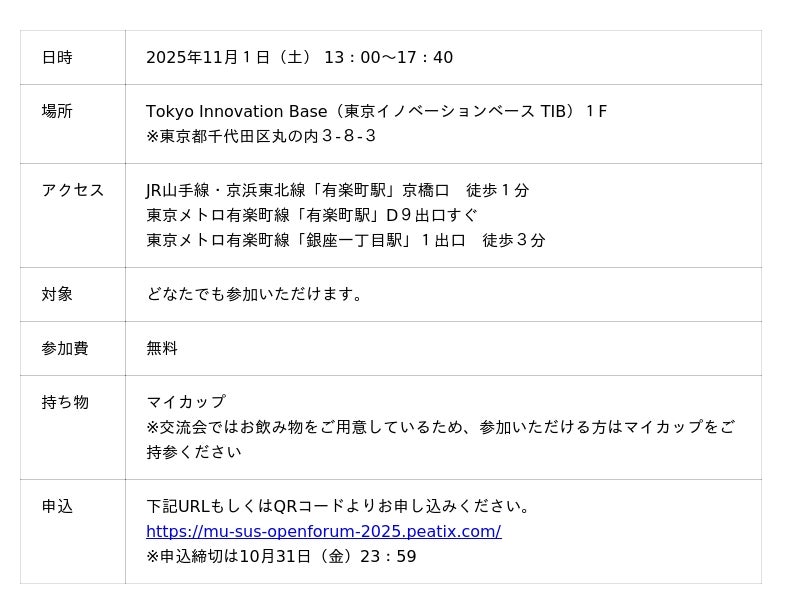 武蔵野大学工学部サステナビリティ学科(東京都江東区、学長:小西 聖子)は2025年11月1日(土)に「サステナビリティオープンフォーラム2025」をTokyo Innovation Base(東京イノベーションベース、有楽町駅徒歩1分)にて実施します。