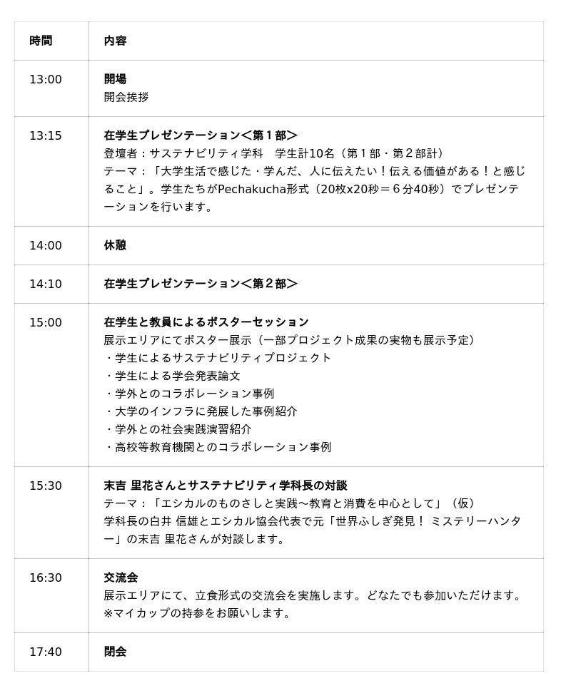 本フォーラムでは、学生によるステージでのプレゼンテーションやポスター展示、ゲストにエシカル協会代表で元「世界ふしぎ発見! ミステリーハンター」の末吉 里花さんをお呼びして学科長との対談、参加者同士の交流会などを予定しています。どなたでも参加可能ですので、サステナビリティやイノベーションにご興味のある方、高校生、教育関係者の皆様、そしてサステナビリティ学科との協働にご関心のあるNPO、行政、企業の皆様のご参加を心よりお待ちしております。