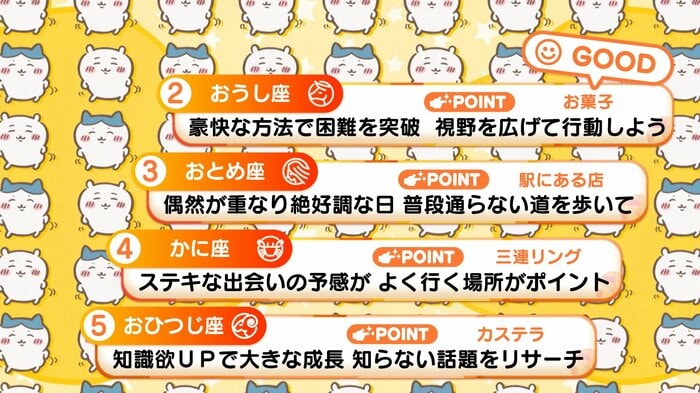 『めざましテレビ』で放送中の「ちいかわ占い」 テレビ放送がない日はお休みで、月~土:朝7時以降に更新予定です。