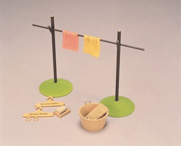 シルバニアファミリーの世界では基本的に、“今よりも少し古い時代を表現”しているんだそうで、1987年に発売されたのは、洗濯機ではなく洗濯板や物干しざおのセットでした。