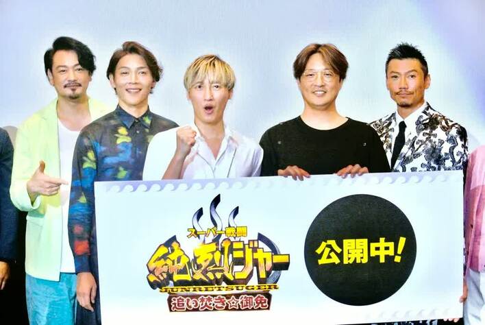 純烈が戦隊ヒーローに扮した映画「スーパー戦闘 純烈ジャー 追い焚き☆御免」の公開初日舞台挨拶が9月1日に東京・新宿バルト9で行われ、純烈の酒井一圭さん&小田井涼平さん&白川裕二郎さん&後上翔太さんのほか、本宮泰風さん、佛田洋監督が登壇。