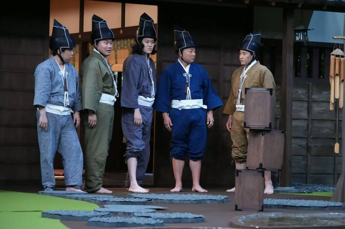 また、長田さん、松尾さん、粗品さん、せいやさん、岡部さんが演じる、5人の御家人たちが鎌暗殿を守るため、暗闇のなか、仕掛けだらけの庭を進むことができるのかを競うコント「鎌暗殿の5人」も登場。