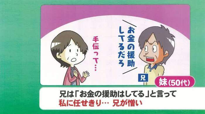 また、「父の介護は自分に任せきりで、兄はお金しか出さない」という50代女性と、「両親の死後、家を継いだ姉が勝手に実家をリフォームしてしまった」という40代女性のエピソードも登場した。