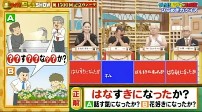 正解は「はなすきになったか?(話す気になったか?/花好きになったか?)」。まねださん、ブルースさん、小堺さんが正解。