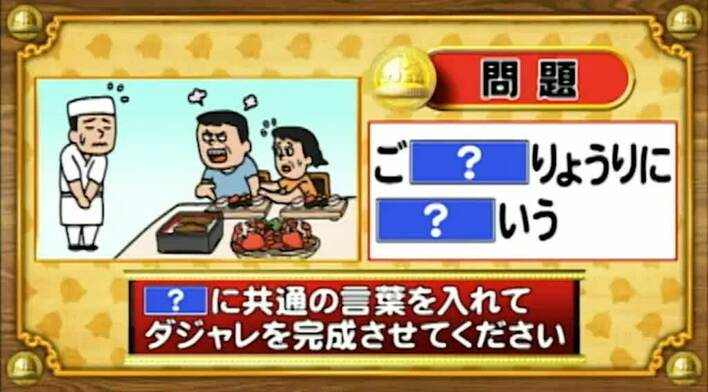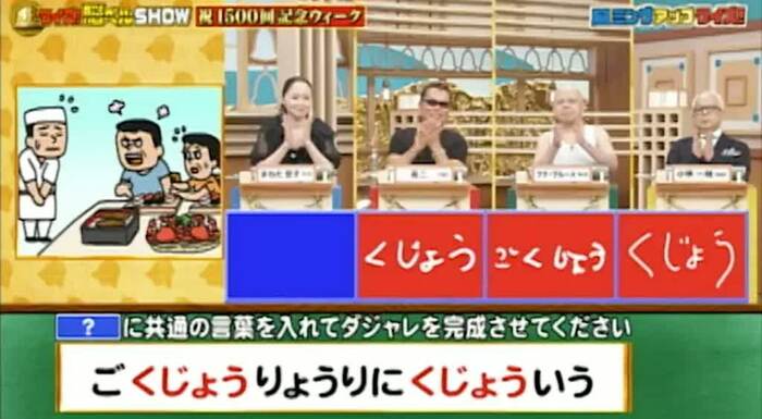 正解は「くじょう(極上料理に苦情言う)」。英二さん、ブルースさん、小堺さんの3人が正解。