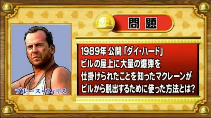 最後は、なつかし映画の問題。今から33年前の1989年に公開された、ブルース・ウィリス主演の映画「ダイ・ハード」。ビルの屋上に大量の爆弾を仕掛けられたことを知った主人公のマクレーンが、ビルから脱出するために使った方法とは?
