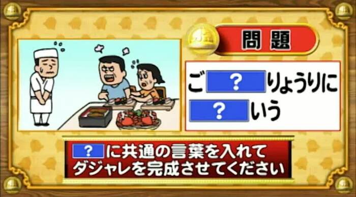 最初は「脳ミングアップクイズ」から、ダジャレ穴埋めの問題。「?」に共通する言葉を入れてダジャレを完成させてください。
