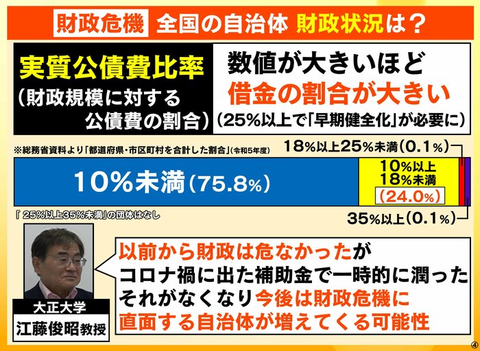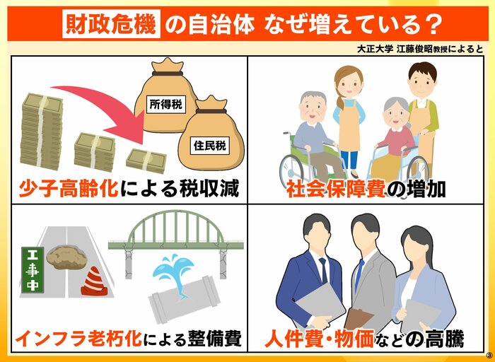 地方自治体の行政に詳しい大正大学の江藤教授によると、少子高齢化による税収減少や社会保障費の増加、インフラ老朽化による整備費、人件費・物価などの高騰によって財政危機の自治体が増えているといいます。