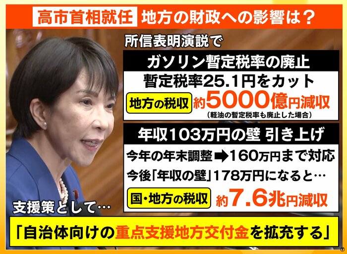 高市首相は所信表明演説でガソリン暫定税率の廃止、年収103万円の壁引き上げに取り組む考えを示しましたが、これらは地方にとっては大幅な税収減少につながります。