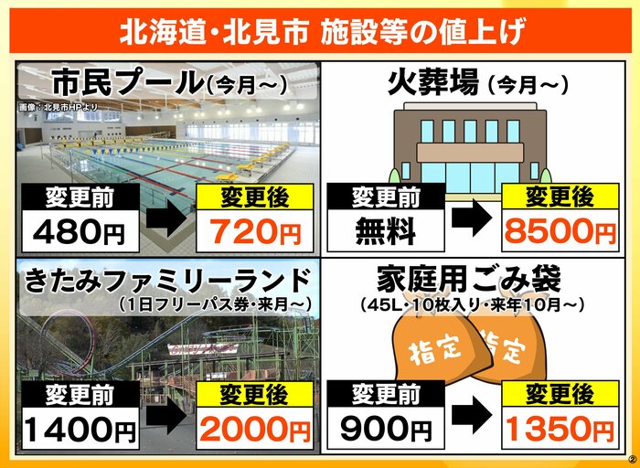 北見市では市民プールや遊園地、家庭用ごみ袋などが値上げ。無料だった火葬場も10月から8500円に…。