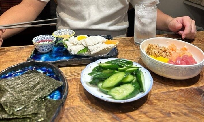 料理をアップで見てみると、小皿にはみずみずしいきゅうりやのりが。のりはあぶったようで、こだわりも感じられます。さらに、ボウルには納豆やたくあん、お刺身のような色とりどりの食材が盛り付けられ、津田さんの手前にはハモのようなものもあり、豊富なラインナップです。