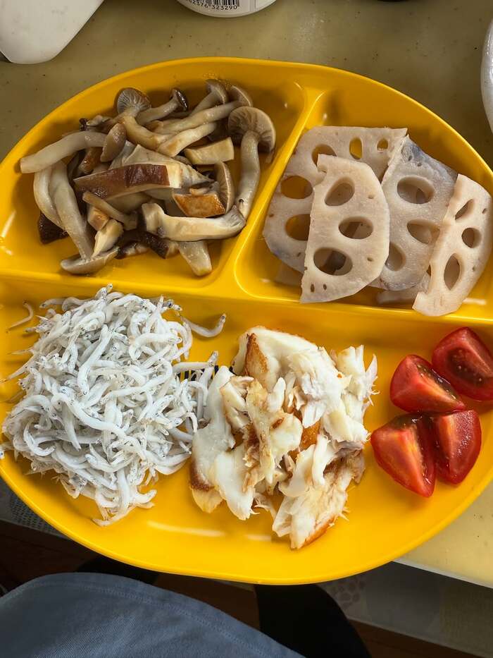 黄色のプレートの上にはレンコンやトマト、しらすに加えて、キノコの炒め物や焼き魚など栄養バランスばっちりなメニューが用意されています。