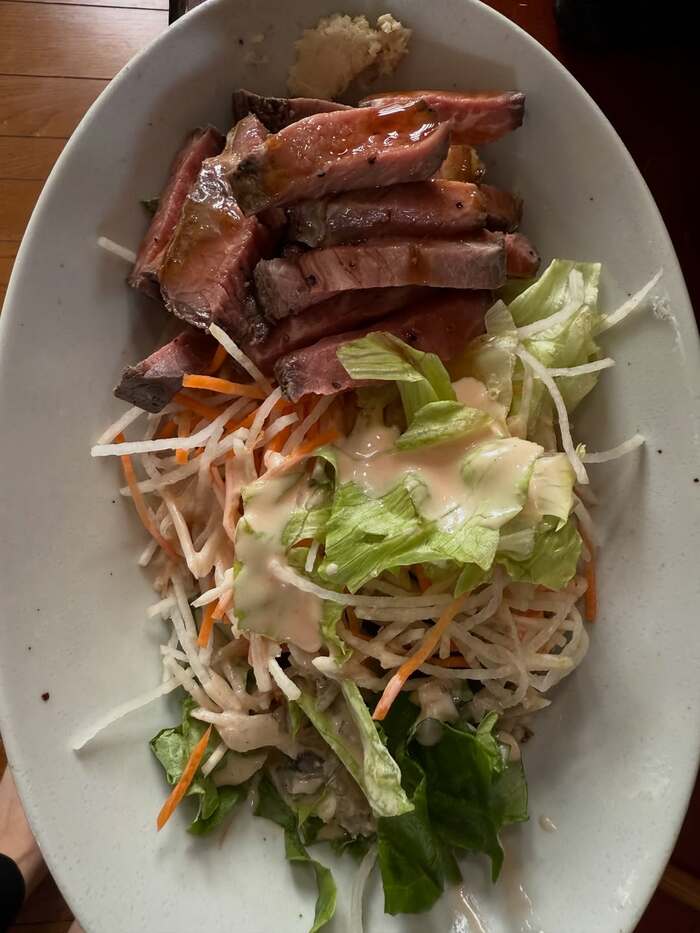 大根やニンジン、レタスのサラダとともにローストビーフが添えてあり、たんぱく質も意識したヘルシーなご飯になっていることがわかります。
