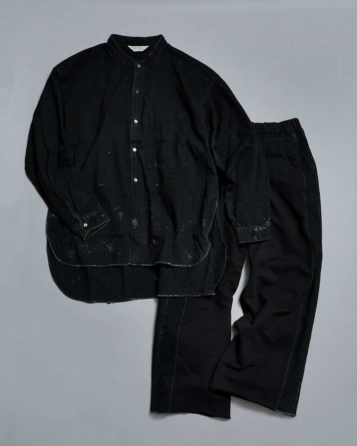 アーカイヴを復刻し、サイジングやダメージディテールなどをアップデートした”カラーレスデニムシャツ“は、日常づかいでの経年変化をイメージし、ダーティーになりすぎない程度のペイントをあしらったもの。ブランドのコアアイテムとも言える“ダメージワッフルクルーロングスリーブシャツ”にも同様にペイントを飛ばし、二次加工の高さに定評がある<アンセルム>の美点を存分に詰め込み仕上げました。“スエットデニムハイブリットイージーパンツ”には、サイドに同色のデニム地の切り替えをほどこし、2つの素材の経年変化が楽しめる仕様に。全体のトーンを統一しながらも、素材のコントラストで奥行きを演出しているため、一着でも様になるパンツです。