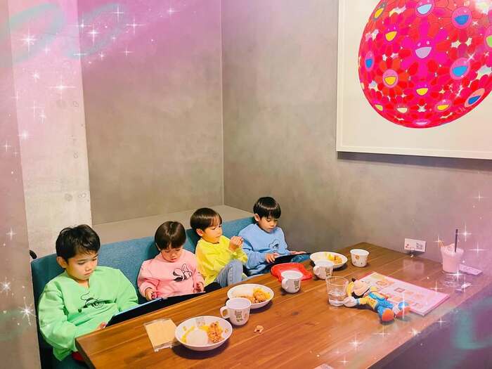 また、この日は雨だったということで、「雨の日は何をして遊ぶんだっけ⁈と私もボーッと考えていたらべベックが「美味しいドリンク飲みたい」って言うのでこんなワチャワチャ賑やかカオス達を急でも受け入れてくれるカフェにレッツラゴーしてみた」と次男“ベベック”くんの提案で、息子4人と出かけた平さん。