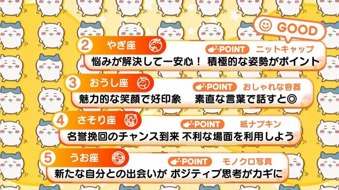 『めざましテレビ』で放送中の「ちいかわ占い」 テレビ放送がない日はお休みで、月~土:朝7時以降に更新予定です。