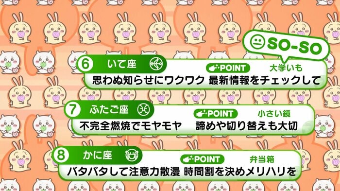 『めざましテレビ』で放送中の「ちいかわ占い」 テレビ放送がない日はお休みで、月~土:朝7時以降に更新予定です。