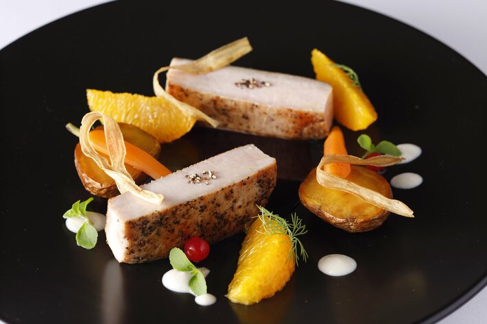“ふくいポーク”ロース肉の低温ロースト牛蒡のピュレとロベールソース オレンジを添えて 2,970円 *パンまたはライス付