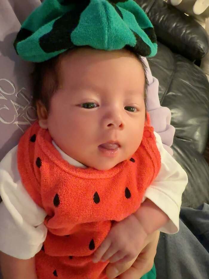そこには、中川さんの膝の上にちょこんと座ったスイカ柄の服と帽子を身に付けた長男と、キウイ柄の服と帽子を被った次男。長男、次男ともに横を向いていて可愛らしい1枚です。