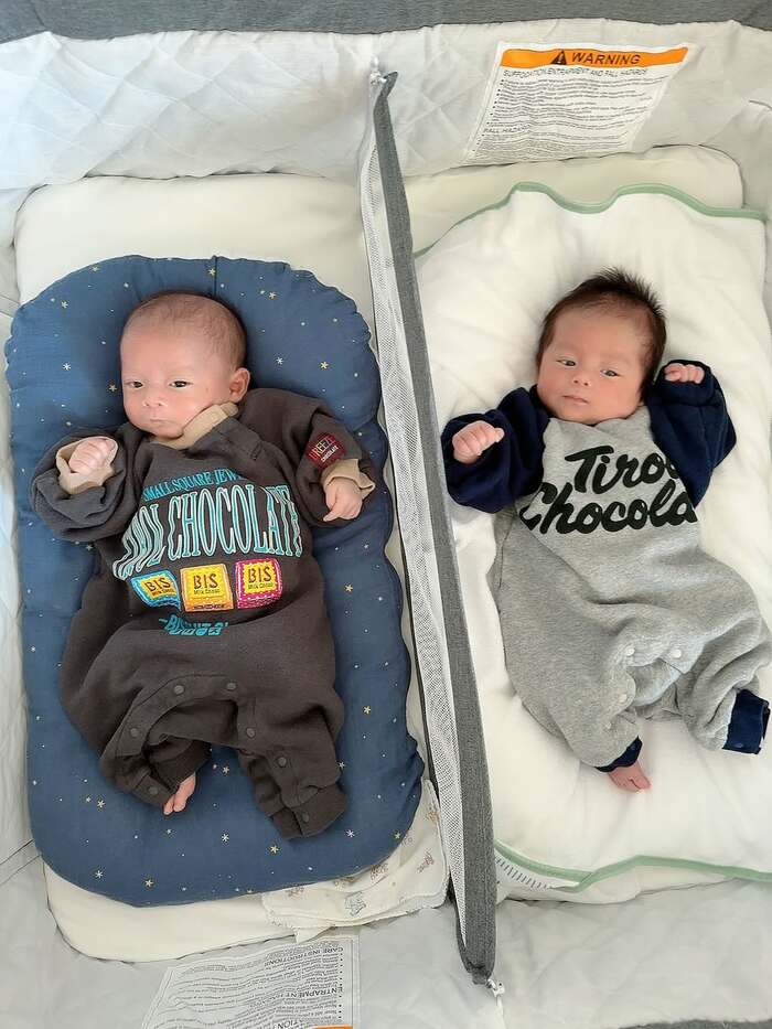 また、チロルチョコのロンパースを着た双子がベットに寝かされた写真も投稿されていて、両手をグーの形にして上に上げるようなそぶりを見せる長男。一方で次男はというと、キリッとした表情でやや横を向き、「さぁ行くぞ!」と聞こえてきそうなポーズをしていて、ついつい見入ってしまうほど尊い姿になっています。