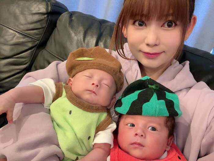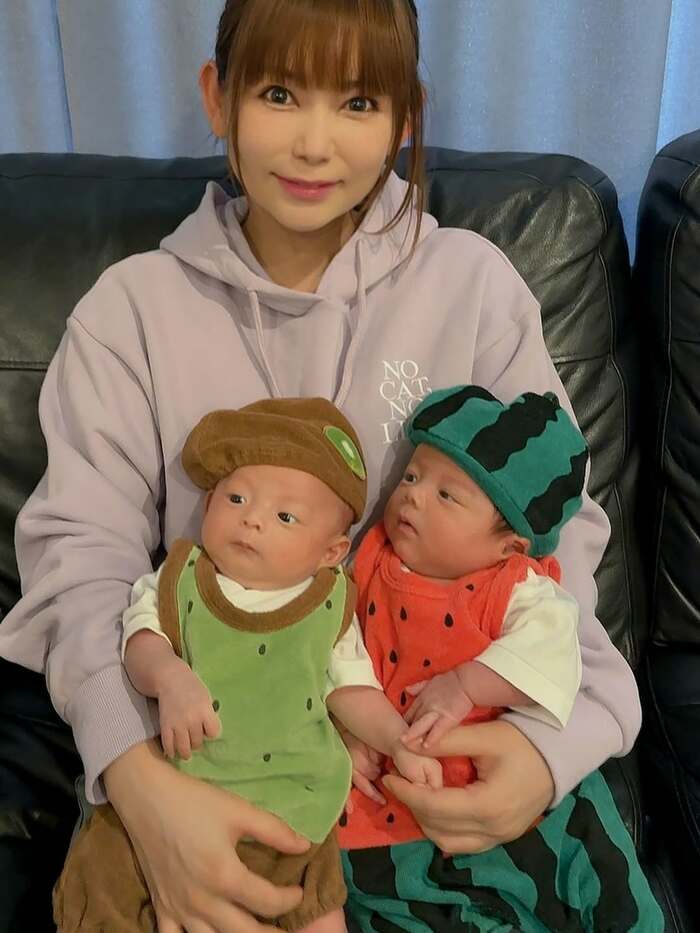 そんな中川さんは今回の投稿で「スイカ キウイ 双子!」とコメントし、新たなベビー服を着こなす双子の様子を複数枚投稿。