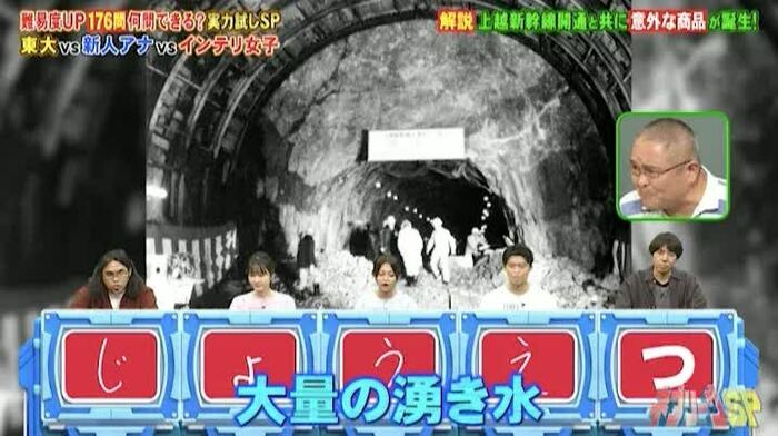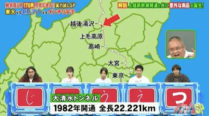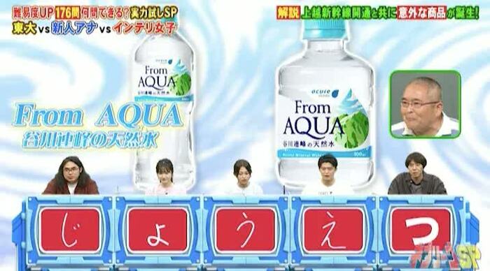 「上越新幹線」の名前を答える問題では、地理担当の村瀬哲史先生が解説をしてくれました。JR東日本の売店や自動販売機で扱っている「From AQUA 谷川連邦の天然水」というミネラルウォーターが、上越新幹線と関係あるというのです。
