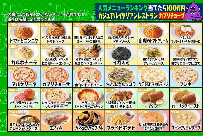 「カプリチョーザ」の人気メニューTOP30の中から、ランキングが低い順に10品を連続で予想。当てた品数に応じて賞金を獲得(10品当てたら100万円獲得)できます。