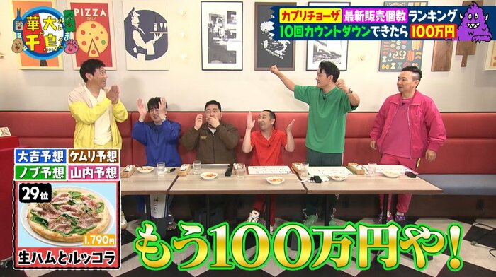 博多華丸さん、博多大吉さん、千鳥(大悟さん、ノブさん)、山内健司(かまいたち)さん、松井さんが、番組が選んだ人気イタリアンレストラン「カプリチョーザ」の人気メニュー30品を、最新販売個数のランキングが低い順にセレクトし、10回連続でカウントダウンできれば100万円を獲得できます。