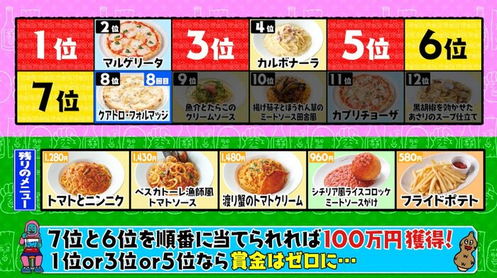 そして、残るはラスト1枠の6位予想。これが正解すれば100万円げっとです。個人予想では、「ペスカトーレ」or「ライスコロッケ」の二択に。