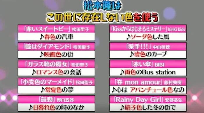 番組では、「単語に“たち”をつける」、「この世にない“色”を使う」など、田中が「珍しい言葉じゃなくても組み合わせによって新しい表現になっている」と語る、松本の書いた歌詞をピックアップして、“言葉の魔術師”と呼ばれる所以なども紐解いた。