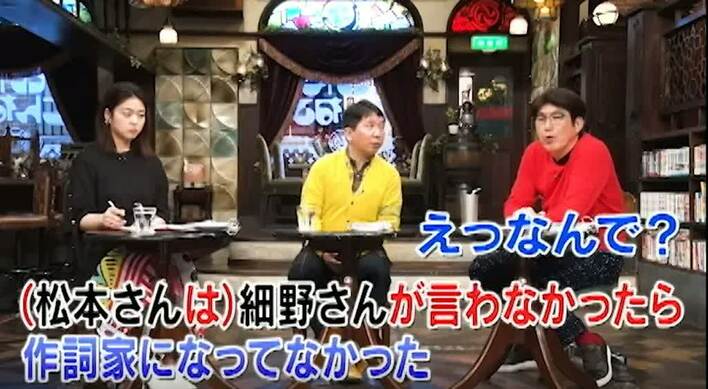 松本は、これまでに2000曲以上作詞し、2017年には紫綬褒章を受章しているが、田中は「細野さんが言わなかったら作詞家になってなかった」と、いつも本を持っていた松本に、細野が「それだけ文学好きだったら詞を書けよ」と言ったことがきっかけで作詞を始めたという逸話を明かした。