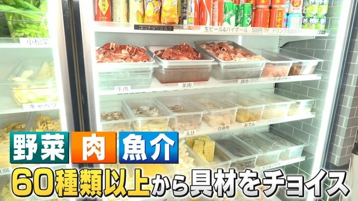 葉物野菜だけでも白菜や小松菜など7種類。キノコも7種類あり、たこ団子などの練り物系、ワンタンや餃子などの点心系など、様々な具材がずらりと並んでいます。