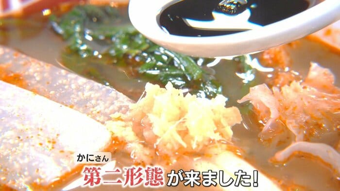 卓上にある生ニンニクや生姜、黒酢などをお好みで加えることができます。かにさんはこれを「第二形態」と呼んでいるといいます。