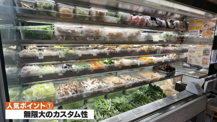 具材は1g=3.1円の量り売りシステムで、食べたい量だけ自分で好きに選ぶことができます。具材と麺、スープの組み合わせは、なんと100万通り以上!自由自在にカスタマイズできちゃうんです。