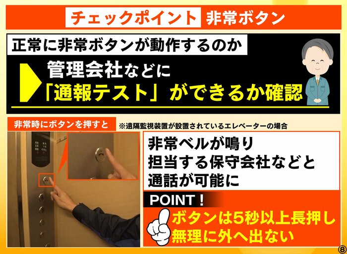 エレベーター内部に設置されている非常ボタンは5秒以上長押しするのがポイント。