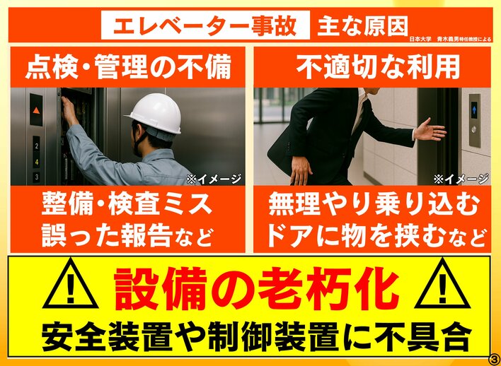 エレベーター事故の主な原因は、点検・管理の不備(整備・検査ミス、誤った報告など)や不適切な利用(無理やり乗り込む、ドアに物を挟むなど)。