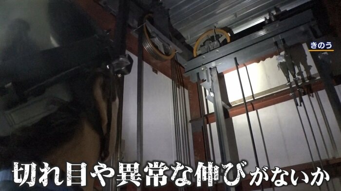 昇降機自体の扉まわりだったり、エレベーターをつってるロープ。汚れてないかだったり、長年使ってくるとどうしても摩耗してきたりすることがあるので、そういった部分を確認します。