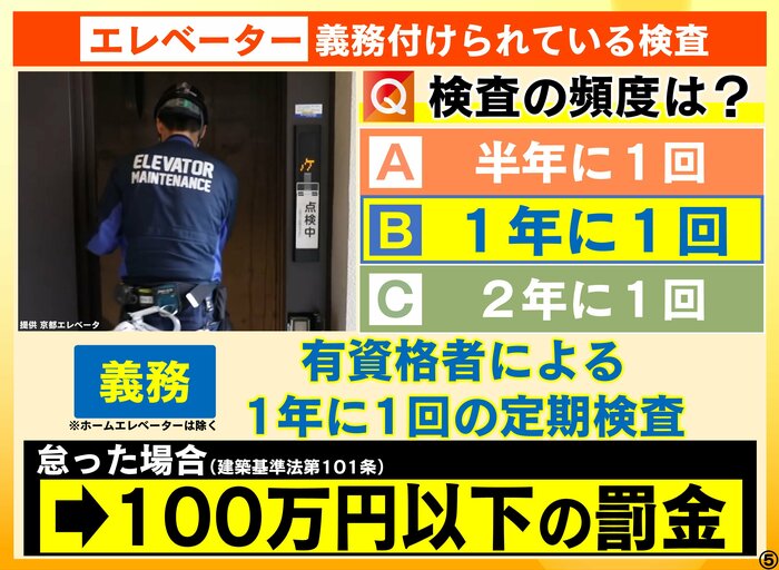 エレベーターは安全確保のため、有資格者による1年に1回の定期検査が法律で義務づけられており、怠った場合は100万円以下の罰金となります。