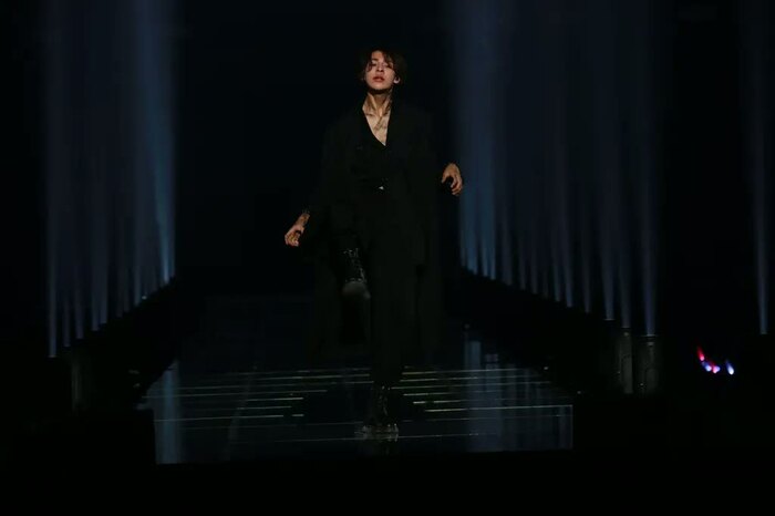 デザイナーである山本耀司氏が、今回のステージのために録り下ろした自身の楽曲「ガラスの時代」に合わせて、ウォーキングを披露すると、歩くたびに、白い花道が黒く染まるという演出が。