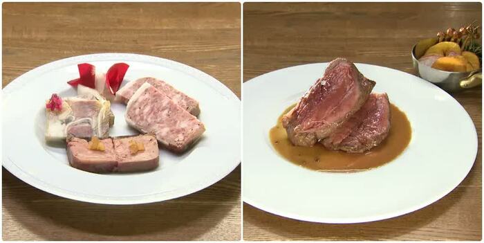 王林が来店したのは、本場フランスで修業したシェフの絶品フレンチが味わえる隠れ家的お店「シャルキュ」。一番人気のアシエット・ド・シャルキュトリ(1400円)は、自家製にこだわっており、なかでも濃厚な白レバーの味わいは坂上もうなるほど。表面をこんがりと焼いた、えぞ鹿のロティ(2900円)は、肉汁があふれ出すジビエ好きにはたまらない一品。パナシェ(500円)で乾杯。※価格は、すべて税別。