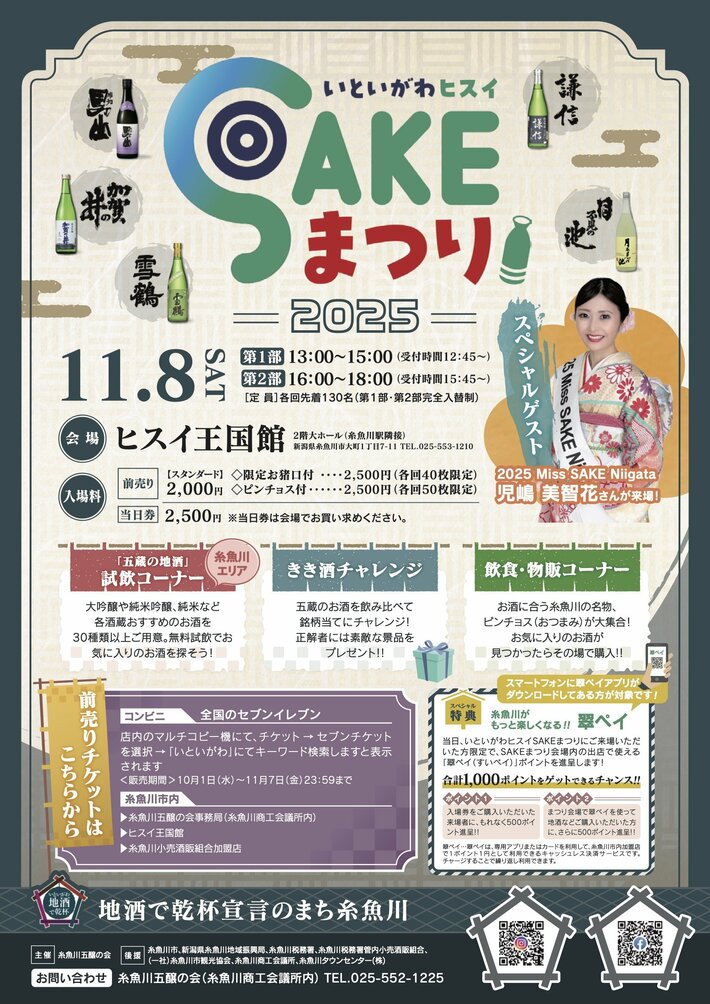 「地酒王国」新潟県。新潟県の西端にある糸魚川市の全5酒蔵が集合する日本酒試飲イベント「いといがわヒスイSAKEまつり」を開催します。蔵人と語らいながら30種類以上の美味しい日本酒を楽しめるイベントです。